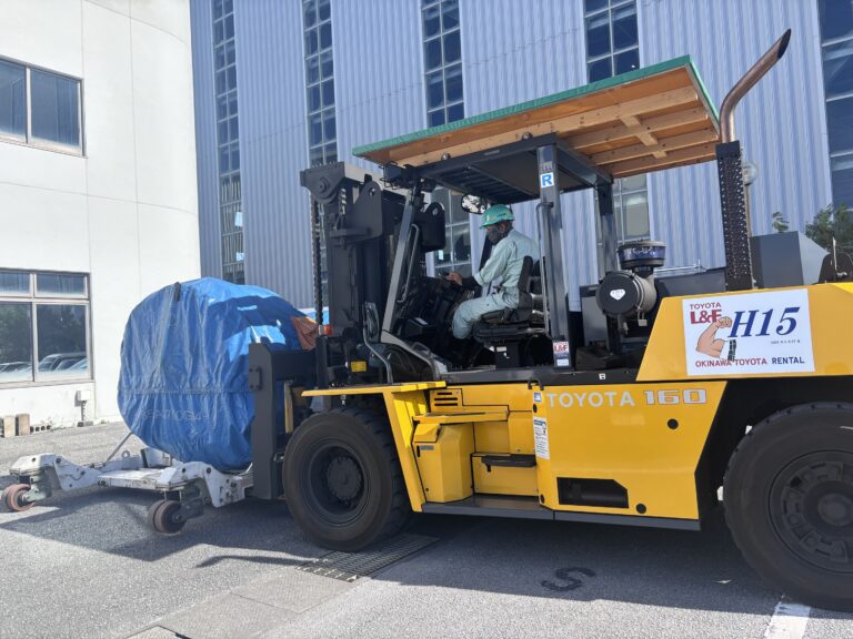 大型エンジンの安全な積込みを確保するため、沖縄の荷受け拠点に15トンフォークリフトと低床エアサスペンショントレーラーを配備しました。重量物であるエンジンの安全な積込み作業に確実に対応し、輸送プロセス時の揺れや衝撃リスクを最小限に抑えることに努めました。