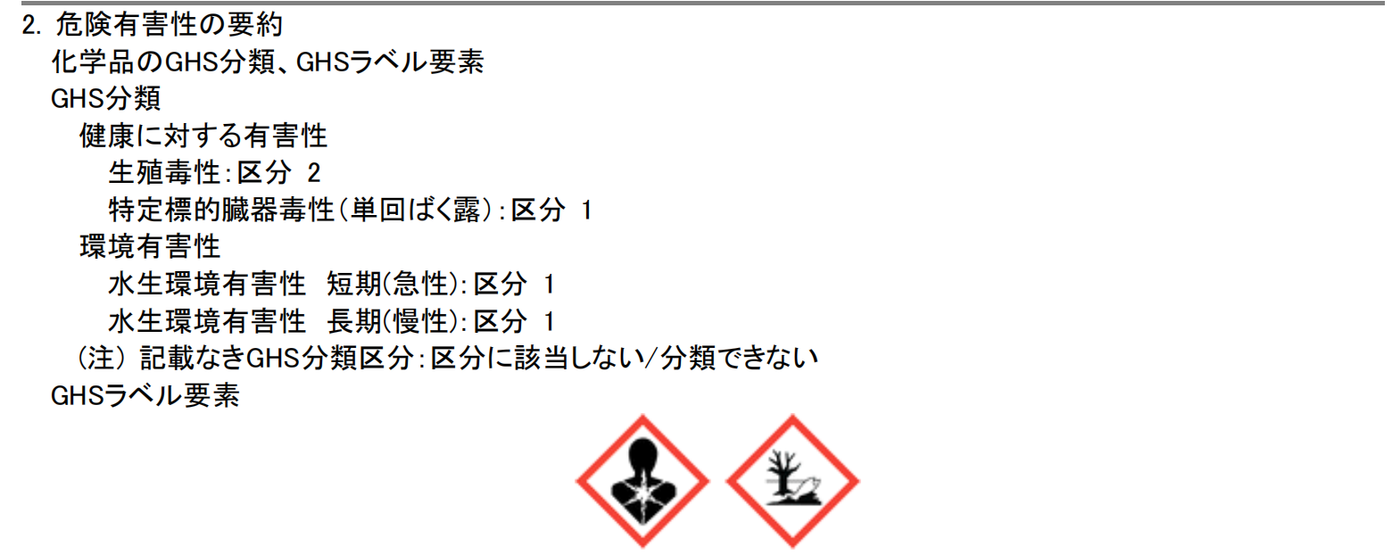 例えば、今回輸出しようとしている貨物の安全データシート(SDS)の第二部分の危険有害性の要約に、[生殖毒性区分2]、[特定標的臓器毒性(単ばく露) 区分1]、[水生環境有害性短期(急性)区分1]、[水生環境有害性 長期(慢性)区分1]が青文字の項目に該当するので、この化学品は危険化学品と判定されます。