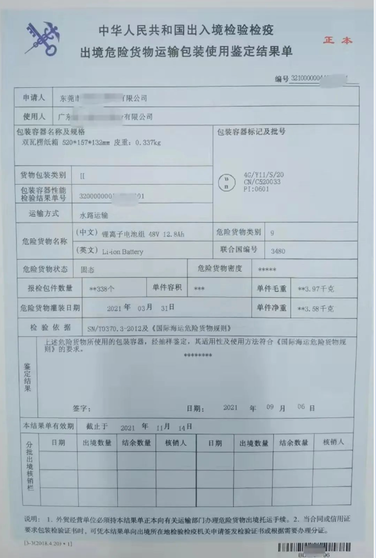 「中華人民共和国進出商品検査法実施条例」により、危険貨物を輸出する際には「輸出危険貨物運送包装使用鑑定結果書」の提出が義務付けられています。